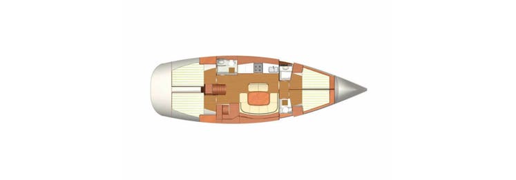 The vessel , which was launched by the French shipyard Dufour, in February 2008, was built in fiberglass with fine wood interior , offering the possibility to accommodate ten guests comfortably eight in four double cabins and two , to occurrence in dinette . The two services are practical and bright , have a shower with hot water.In the Dinette we find extensive measures already from the kitchen , equipped with a gas cooker with oven, double sink, refrigerator and ice , which certainly will not miss the chance to have cold drinks and food well preserved , and a large table surrounded by sofas allows to have lunch at the same time the whole crew ; find the electronic instrumentation in the cockpit , VHF, GPS plotter, eco -sounder , autopilot , wind etc. . , which will allow us an easier and safer navigation . The boat is equipped with a stereo system with MP3 CD player , speakers inside and outside , covered in so much space to relax in the sun. The presence on board of the system 220V , allow you to recharge the batteries of the phones or other equipment to use without having to go back to the ground. On deck , a large cockpit with fixed table , equipped with awning, where the on-board instrumentation and dual steering , allowing however, a large and comfortable passage to the stern, where you will find the ladder to get in the water and the outdoor shower , also with hot water. The performance characteristics of the hull , together with a sail area of over 100 square meters , along with the 55 hp engine allows a cruising speed of about 7 knots , allowing great distances every day.