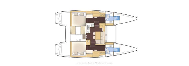 The new Lagoon 39 fits between the essential Lagoon 380 and the 400 S2. The exterior is characterized by comfort and safety with a simple, efficient deck layout allows to control the main maneuvers from the steering station, and for an easy and protected boarding and with broad sidedecks, with recessed deck hatches. The cockpit is well protected and comfortable, with a wide crossing passage aft, a dining table to port and a settee to starboard and a direct access to the steering station from the cockpit AND from the deck. The cabins have incomparable natural lighting thanks to the fixed hull windows, together with excellent ventilation thanks to the deck hatches and portholes that open out to the hull-side. The saloon includes a large dining area forward to starboard, a chart table with a panel for navigation electronics and a small desk with a flap. Aft to port, the « L » shaped galley has a direct access to the cockpit for a better usability and conviviality. An important innovation is the possibility to have a 2 luxurious cabin owner's version, with a king size bed, a desk, a sofa, a large hanging locker and a wide bathroom forward in each hull.